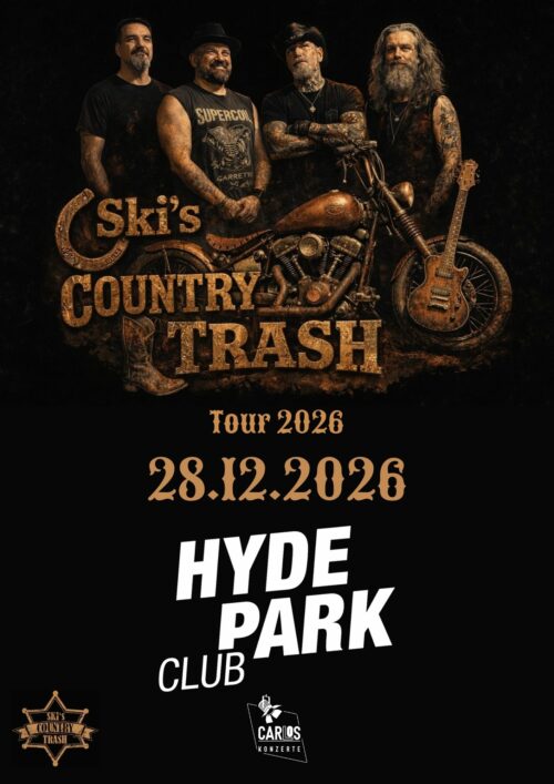 "Kein weichgespülter Nashville‑Sound und keine Retro‑Show: Ski’s Country Trash steht für einen eigenständigen Mix aus Country, Rock und Punk, der sofort ins Ohr geht. Andrew James (ehemals Ski King) ist mit seiner unverkennbaren Stimme das Zentrum der Band – eine Stimme, die zwischen Johnny Cash, Elvis‑Vibe und modernem Rock’n’Roll pendelt, ohne jemals zur Kopie zu werden" Einlass: 19:00 Uhr Beginn: 20:00 Uhr Infos & Tickets hier!