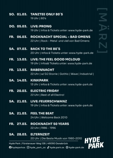 A Depeche Mode CelebrationLesung mit Markus Kavka & Konzert von RemodeAm Pfingstsonntag, dem 24. Mai 2026, feiert der Hyde Park Osnabrück das Jahr seines 50-jährigen Jubiläums – mit einem Abend, der Literatur und Live-Musik auf besondere Weise verbindet.Den Auftakt macht Markus Kavka: Der sympathische Musikjournalist (MTV/VIVA und mehr) liest aus seinem Buch über Depeche Mode – persönlich, klug und voller Geschichten aus Jahrzehnten zwischen Bühne, Backstage und Fernsehstudio.Für die Lesung wird der Veranstaltungsbereich temporär bestuhlt. Anschließend räumen wir die Tanzfläche und drehen die Lautstärke auf:Remode, die rockige Depeche-Mode-Coverband aus Bielefeld, bringt mit druckvollen Sounds, Gänsehaut-Momenten und enormer Bühnenpräsenz die Klassiker live auf die Bühne.