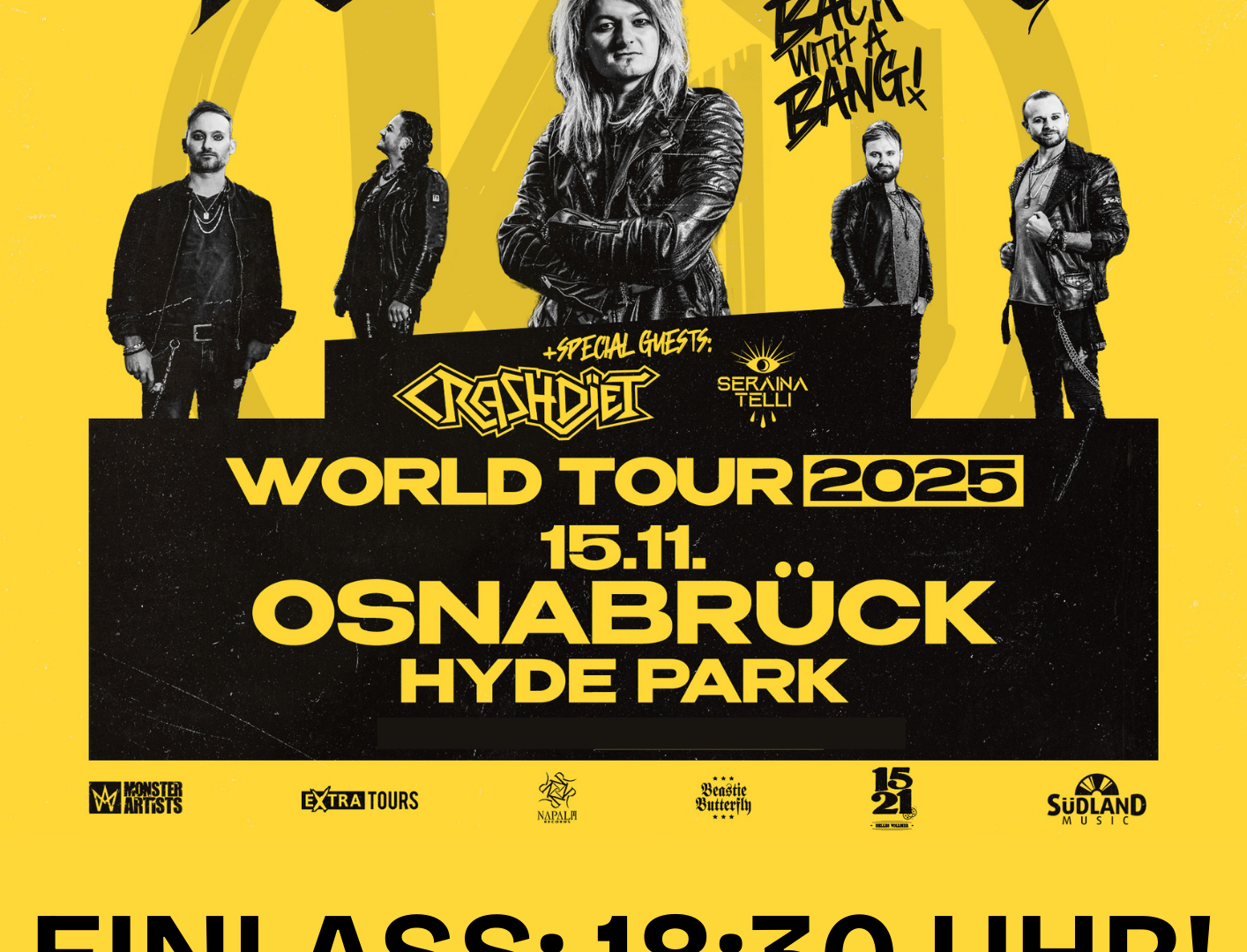 Termin Details Datum: 15.11.2025 18:30 – 23:55 Ort: Hyde Park Terminkategorien: Hyde Park Konzerte Einlass: 18.30 Uhr Beginn: 19.15 Uhr Infos & Tickets hier!